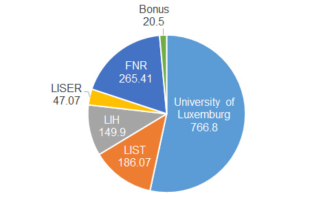 Was das Budget des FNR betrifft werden rund 94% durch kompetitive Förderprogramme an berechtigte Bewerber (darunter auch die Universität Luxemburg und die 3 öffentlichen Forschungsinstitute) verteilt. Die Verteilung der Fördermittel des FNR wird auf Basis von Gutachten internationaler Experten über Anträge der Bewerber beschlossen.