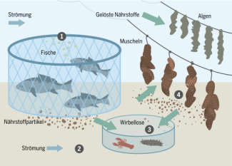 À gauche: Élevage de saumons atlantiques aux îles Féroé. Photo : Erik Christensen (via Wikimedia Commons). À droite : Principe de l'aquaculture. Quand les poissons d’élevage sont confinés dans des cages ou des filets et qu'ils sont nourris activement 1, leurs déjections entraînent en général une surfertilisation de leur environnement. On peut éviter ce phénomène en installant, dans le sens du courant 2, d'autres organismes capables de consommer les déjections. Les crevettes, crabes ou concombres de mer 3 élevés en cage se nourrissent des particules de déjections et de nourriture qui coulent. Les coquillages 4 filtrent les plus fines particules. Et leurs déjections profitent à leur tour aux algues et aux invertébrés. Photo : Petra Böckmann (via Wikimedia Commons)